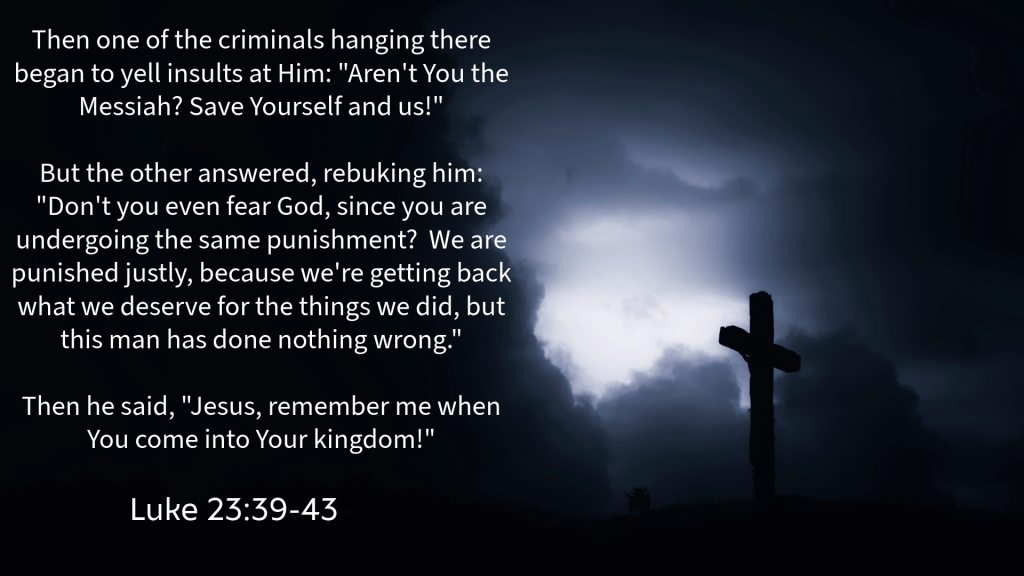 But the best thing of all is what we learn from what Jesus said to the criminal on the cross. Salvation is a free gift, and it’s all about being with Jesus. Even when we are suffering here and now in this life, Jesus is present with us through His Holy Spirit.